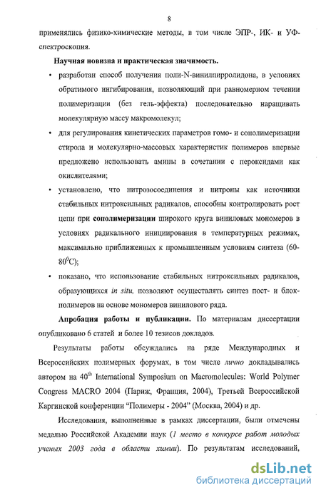 установлено, что нитрозосоединения и нитроны как источники стабильных нитроксильных радикалов способны контролировать рост цепи при сополимеризации широкого круга виниловых мономеров в условиях радикального инициирования в температурных режимах, максимально приближенных к промышленным условиям синтеза (бО-80С);