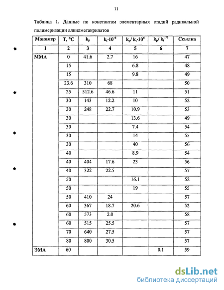 Для цетилметакрилата (ЦМА) при полимеризации в бензоле, гептане и гептаноле [67] были получены порядки по мономеру 1.9 при концентрациях мономера 50%. Оцененное значение кр для ЦМА не слишком отличалось от соответствующей величины для ММА (кр=251 л/моль-с для ММА и 120±30 л/моль-с для ЦМА), но kt для этих мономеров различались практически на два порядка (kt=21-106 л/моль-с для ММА и 0.16-10б л/моль-с для ЦМА). Такое падение kt не может быть объяснено более высокой вязкостью ЦМА по сравнению с вязкостью ММА. По мнению авторов [117], это связано с тем, что полимеры типа полицетилметакрилата склонны к относительно сильному JL. (увеличение) наблюдалось также при полимеризации ММА в среде ДМСО, диэтилфталата и N-метилпирролидона; при полимеризации ММА в хлорбензоле величина кр уменьшалась на 7%. Исследование влияния таких растворителей как 2-гептанон и н-октилацетат на кинетику полимеризации бутил- (БМА), додецил- (ДМА) и циклогексилметакрштатов (ЦГМА) [120] показало, что кр для БМА слабо увеличивается в гептаноне при Т=90С, и не изменяется при Т=30С. В случае полимеризации ДМА и ЦГМА в данных растворителях наблюдается сильное влияние на кр, а именно, кр для ДМА уменьшается на 26% при Т=90С и на 14% при Т=30С; кр для ЦРМА гораздо сильнее уменьшается при Т=30С (на 40%), и практически не изменяется при Т=90С. Связано это, по мнению авторов, с локальной концентрацией мономера (в микрообластях нахождения активных центров), отличающихся от среднеобъемных.