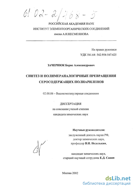 Зачернюк Борис Александрович. Синтез и полимераналогичные превращения серосодержащих полиариленов : диссертация ... кандидата химических наук : 02.00.06.- Москва, 2002.- 122 с.: ил. РГБ ОД, 61 02-2/468-5