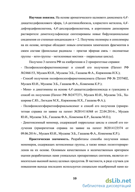 Таким образом, в найденных нами оптимальных условиях синтезированы полимеры, обладающие новым сочетанием химических фрагментов -арильные радикалы с различными мостиковыми группировками, простая эфирная связь и оксиматные группы. При этом, полученные полимеры и сополимеры обладают высокой тепло-, термо-, хемстойкостью, уникальными физико-химическими характеристиками, а так же растворимостью в ряде органических растворителей, что позволит использовать эти полимеры в качестве суперконструкционных полимерных материалов в различных отраслях промышленного производства.