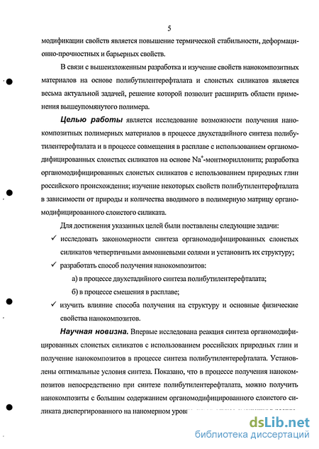 Целью работы является исследование возможности получения нанокомпозитных полимерных материалов в процессе двухстадийного синтеза полибутилентерефталата и в процессе совмещения в расплаве с использованием органомодифицированных слоистых силикатов на основе №+-монтмориллонита; разработка органомодифицированных слоистых силикатов с использованием природных глин российского происхождения; изучение некоторых свойств полибутилентерефталата в зависимости от природы и количества вводимого в полимерную матрицу органо-модифицированного слоистого силиката.
