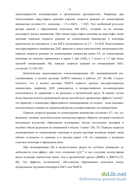 Добавление в реакционную систему АН/MA третьего мономера - итаконовой кислоты приводит к резкому уменьшению скорости процесса и молекулярной массы сополимера [76], что позволяет считать ИТК не просто сомономером, а малоэффективным ингибитором. АК или МАК оказывают существенно меньшее влияние на кинетику сополимеризации, т.к. образуют более активные радикалы, чем ИТК. Для систем, содержащих ИТК, АК или МАК, порядок скорости полимеризации по концентрации инициатора заметно выше 0.5, что согласуется и с концепцией дополнительного мономолекулярного обрыва цепи в водно-солевых средах, и является следствием замедляющего влияния третьего мономера. Порядок скорости реакции по суммарной концентрации мономеров для тройных систем АН/МА/виниловая кислота составляет 1.25 - 1.6 [23, 76-78].