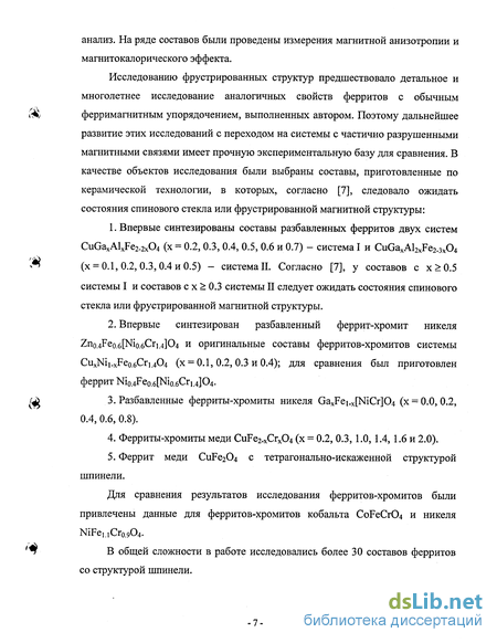 Исследованию фрустрированных структур предшествовало детальное и многолетнее исследование аналогичных свойств ферритов с обычным ферримагнитным упорядочением, выполненных автором. Поэтому дальнейшее развитие этих исследований с переходом на системы с частично разрушенными магнитными связями имеет прочную экспериментальную базу для сравнения. В качестве объектов исследования были выбраны составы, приготовленные по керамической технологии, в которых, согласно [7], следовало ожидать состояния спинового стекла или фрустрированной магнитной структуры: