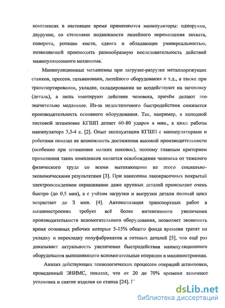 Манипуляционные механизмы при загрузке-разрузке металлорежущих станков, прессов, гальванованн, литейного оборудования и т.д., а также при транспортировании, укладке, складировании не воздействуют на заготовку (деталь), а лишь имитируют действие человека, причём делают это-значительно медленнее. Из-за недостаточного быстродействия снижается производительность основного оборудования. Так, например, в холодной листовой штамповке КГШП делает 60-80 ударов в мин., а цикл работы манипулятора 3,5-4 с. [2]. Опыт эксплуатации КГШП с манипуляторами и роботами показал не возможность достижения высокой производительности (особенно при штамповке мелких поковок), поэтому главным критерием применения таких комплексов является освобождение человека от тяжелого физического труда со всеми вытекающими из этого социально-экономическими результатами [3]. При нанесении лакокрасочных покрытий электроосаждением окрашивание даже крупных деталей происходит очень быстро (до 0,5 мин), а с учётом загрузки и выгрузки детали полный цикл возрастает до 3 мин. [4]. Автоматизация транспортных работ в машиностроении требует всё более интенсивного увеличения производительности вспомогательного оборудования, позволяет экономить время основных рабочих которые 5-15% общего фонда времени тратят на укладку и перекладку полуфабрикатов и готовых деталей [5], что ещё раз доказывает актуальность увеличения быстродействия манипуляционного оборудования выполняющего вспомогательные операции в машиностроении. Анализ действующих технологических процессов операций штамповки, проведенный ЭНИМС, показал, что от 20 до 70% времени занимают установка и снятие изделия со станка [24]. На специальных технологических