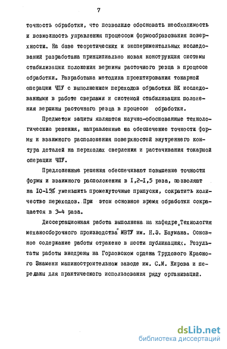 В работе установлены закономерности влияния технологических факторов на отклонения формы, взаимного расположения и шероховатости поверхности для переходов обработки сверлами одностороннего резания и резцами, оснащенными не-перетачиваемыми пластинами из твердого сплава. Выявлено влияние параметров элементов технологической системы на точность обработки, что позволило обосновать необходимость и возможность управления процессом формообразования поверхности;. На базе теоретических и экспериментальных исследований разработана принципиально новая конструкция системы стабилизации положения вершины расточного резца в процессе обработки» Разработана методика проектирования токарной операции ЧПУ с выполнением переходов обработки ВК исследованными в работе сверлами и системой стабилизации положения вершины расточного, резца в процессе обработки.