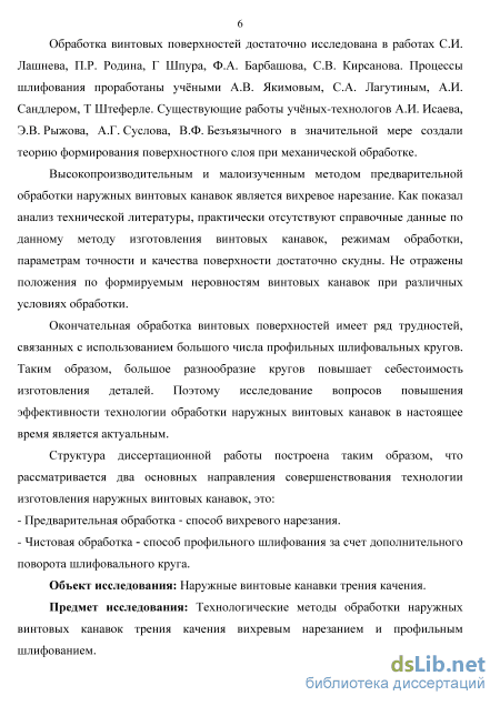 Как показал анализ технической литературы, справочные данные по вихревому назначению винтовых канавок, режимам обработки, параметрам точности и качества поверхности достаточно скудны. Отсутствуют теоретические положения по формируемым неровностям винтовых канавок при различных условиях обработки. Окончательная обработка винтовых поверхностей имеет ряд трудностей, связанных с использованием большого числа профильных шлифовальных кругов, что повышает себестоимость изготовления деталей. Поэтому исследование вопросов повышения эффективности технологии обработки наружных винтовых канавок в настоящее время является актуальным.
