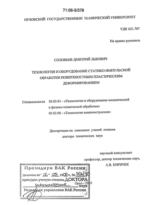 научно-технической программой министерства образования № 4387 «Управление параметрами деформационного упрочнения деталей машин статико-импульсной обработкой» 01.01.2005 г. -31.12.2005 г.;