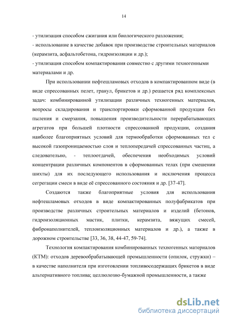 Анализ отечественной и зарубежной литературы показывает [35-73], что в настоящее время известны следующие способы утилизации нефтешламовых отходов: получение сырьевых компонентов; получение готовой продукции (битума, котельного топлива, нефтекокса и др.); утилизация способом сжигания или биологического разложения; использование в качестве добавок при производстве строительных материалов (керамзита, асфальтобетона, гидроизоляции и др.); утилизация способом компактирования совместно с другими техногенными материалами и др. При использовании нефтешламовых отходов в компактированном виде (в виде спрессованных пелет, гранул, брикетов и др.) решается ряд комплексных задач: комбинированной утилизации различных техногенных материалов, вопросы складирования и транспортировки сформованной продукции без пыления и смерзания, повышения производительности перерабатывающих агрегатов при большей плотности спрессованной продукции, создания наиболее благоприятных условий для термообработки сформованных тел с высокой газопроницаемостью слоя и теплопередачей спрессованных частиц, а следовательно, - теплоотдачей, обеспечения необходимых условий концентрации различных компонентов в сформованных телах (при смешении шихты) для их последующего использования и исключения процесса сегрегации смеси в виде её спрессованного состояния и др. [37-47].