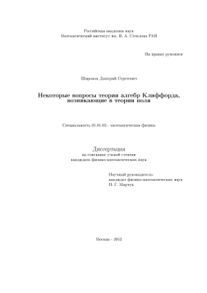 В данной диссертационной работе исследуются некоторые вопросы теории алгебр Клиффорда, возникающие в математической физике, в частности, в теории поля. Целью работы является установление связи между двумя наборами элементов алгебры Клиффорда, удовлетворяющих определяющим антикоммутационным соотношениям алгебры Клиффорда, и нахождение алгоритма вычисления явного вида элемента алгебры Клиффорда, осуществляющего эту связь. Еще одна цель - применение полученных результатов ДЛЯ изучения СВЯЗИ CIl Il Iiopil ЫХ И ортогональных групп, а именно, получение явной формулы для вычисления элементов спинорных групп по заданным элементам ортогональных групп.