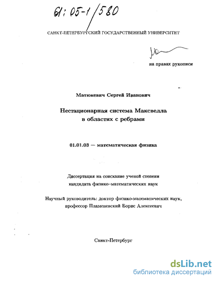 Мы изучаем нестационарную систему Максвелла dE/dt - rot В = -J, дВ/dt + rot Ё = -G, ( , divE = р, divB = їх в областях с ребрами и коническими точками. Рассматриваются краевые условия двух типов: [Ёхи\ = [Фхи\, {В-и)=ф (2) г7х [В х 0\+ф[Рх Ё) = [Ф х v\, (3) где v - единичный вектор внешней нормали, а через ф обозначена некоторая комплекснозначная функция (импеданс), характеризующая физические свойства границы. В работе обсуждаются разрешимость задачи в подходящих функциональных пространствах, вывод и обоснование асимптотических представлений для решений вблизи особенностей границы, формулы для коэффициентов в асимптотике. Диссертация состоит из введения и трех глав. В первых двух главах изучается нестационарная система Максвелла с однородными краевыми условиями (2). Рассматриваются модельный конус, ограниченная область с конической точкой, клин и волновод, сечение которого - ограниченная область с угловой точкой. Третья глава посвящена изучению нестационарной системы Максвелла с неоднородными краевыми условиями (2) и (3) в областях с коническими точками и ребрами.