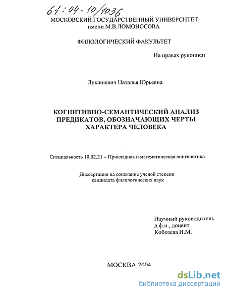 Данная работа посвящена проблеме описания имен характеров — слов, называющих либо человека по свойствам его характера, либо сами характерологические свойства. Особенностью слов данного семантического поля является то, что обозначаемое ими свойство непосредственно не наблюдаемо, а приписывается его носителю на основе обобщения, извлекаемого из анализа конкретных случаев поведения человека. В связи с этим их значениям весьма сложно дать адекватное описание, используя традиционные методы семантического анализа.