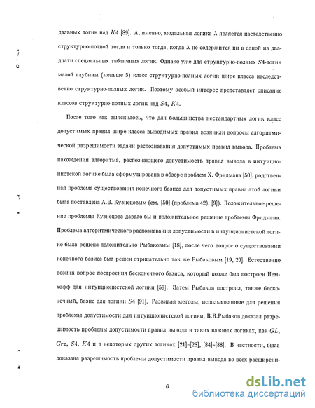 После того как выяснилось, что для большинства нестандартных логик класс допустимых правил шире класса выводимых правил возникли вопросы алгоритмической разрешимости задачи распознавания допустимых правил вывода. Проблема нахождения алгоритма, распознающего допустимость правил вывода в интуиционистской логике была сформулирована в обзоре проблем X. Фридмана [50], родственная проблема существования конечного базиса для допустимых правил этой логики была поставлена А.В. Кузнецовым (см. [50] (проблема 42), [9]). Положительное решение проблемы Кузнецова давало бы и положительное решение проблемы Фридмана. Проблема алгоритмического распознавания допустимости в интуиционистской логике была решена положительно Рыбаковым [18], после чего вопрос о существовании конечного базиса был решен отрицательно так же Рыбаковым [19, 20]. Естественно возник вопрос построения бесконечного базиса, который позже был построен Ием-хофф для интуиционистской логики [59]. Затем Рыбаков построил, также бесконечный, базис для логики S4 [91]. Развивая методы, использованные для решения проблемы допустимости для интуиционистской логики, В.В.Рыбаков доказал разрешимость проблемы допустимости правил вывода в таких важных логиках, как QL, Grz, S4, К4 и в некоторых других логиках [21]-[28], [84]-[88]. В частности, была доказана разрешимость проблемы допустимости правил вывода во всех расширени ях логики 5"4.3, ЧТО является обобщением результата Файна [48] о разрешимости данных логик. На основе техники, разработанной В.В. Рыбаковым, проблема допустимости была решена для различных индивидуальных транзитивных логик (см. например [1, 2, 37, 5]).