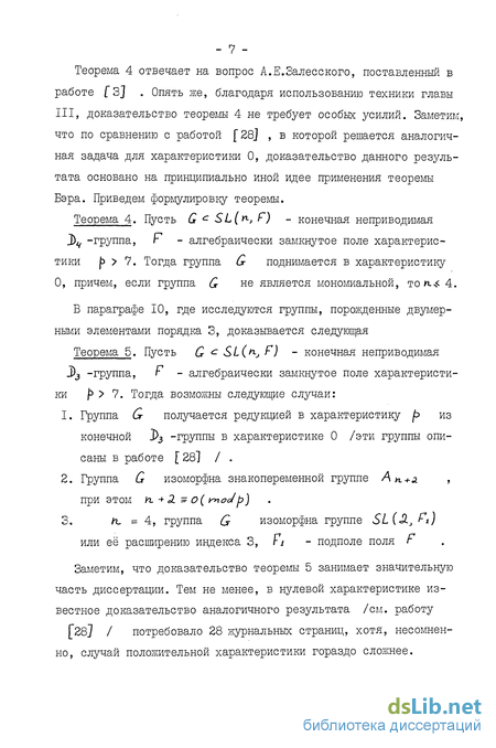 В работах ["28] , [29] , [33] получена классификация конечных неприводимых линейных групп, порожденных двумерными элементами, в случае поля нулевой характеристики. Разработанные при этом методы существенно используют предположение о том, что характеристика поля г равна 0. Естественно возникает задача описания неприводимых линейных групп, порожденных двумерными элементами, над полем положительной характеристики. Цель настоящей диссертации - классификация конечных неприводимых линейных групп над полем г характеристики jp 7, порожденных двумерными элементами, которые не являются инволюциями. Ограничение на характеристику поля вызвано тем, что при малых f возникает множество различных случаев, требующих отдельного рассмотрения. Введем некоторые соглашения, .связанные с терминологией. Двумерные элементы порядка 1 из группы SL(n., F) будем называть j)r -элементами. Группу, порожденную двумерными элементами, будем называть J) -группой. Линейная группа Q с QL{_V) называется Z -мерной, если пространство V размерности п. можно представить в виде прямой суммы неприводимого G -модуля размерности z и тривиального С -модуля размерности Теорема 3. Пусть Q cSlL ) - конечная неприводимая iz. -группа, "с У/ 5, Г - алгебраически замкнутое поле характеристики f 7. Тогда к 4 4, и группа G поднимается в характеристику 0. Теорема 4 отвечает на вопрос А.Е.Залесского, поставленный в работе [3] . Опять же, благодаря использованию техники главы III, доказательство теоремы 4 не требует особых усилий. Заметим, что по сравнению с работой [28] , в которой решается аналогичная задача для характеристики 0, доказательство данного результата основано на принципиально иной идее применения теоремы Бэра. Приведем формулировку теоремы. Теорема 4. Пусть G с SL(K; Р) - конечная неприводимая J) -группа, F - алгебраически замкнутое поле характеристики р 7. Тогда группа & поднимается в характеристику О, причем, если группа Q не является мономиальной, TOK.S 4. В параграфе 10, где исследуются группы, порожденные двумерными элементами порядка 3, доказывается следующая