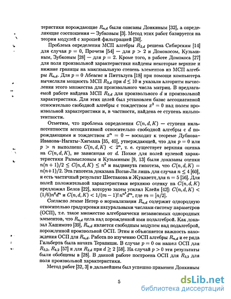 Проблема определения МСП алгебры R24 решена Сибирским [14] для случая р = 0, Прочези [54] — для р > 2 и Домокосом, Кузьминым, Зубковым [28] — для р = 2. Кроме того, в работе Домокоса [27] для поля произвольной характеристики найдены некоторые верхние и нижние границы на максимальную степень элементов из МСП алгебры Rn,d- Для р = 0 Абеасис и Питталуга [18] при помощи компьютера вычислили мощность МСП i?3,d при d < 10 и указали алгоритм вычисления этого множества для произвольного числа матриц. В предлагаемой работе найдена МСП Rz,d для произвольного d и произвольной характеристики. Для этих целей был установлен базис ассоциативной относительно свободной алгебры с тождеством х3 = 0 над полем произвольной характеристики и, в частности, найдена ее ступень нильпотентности.