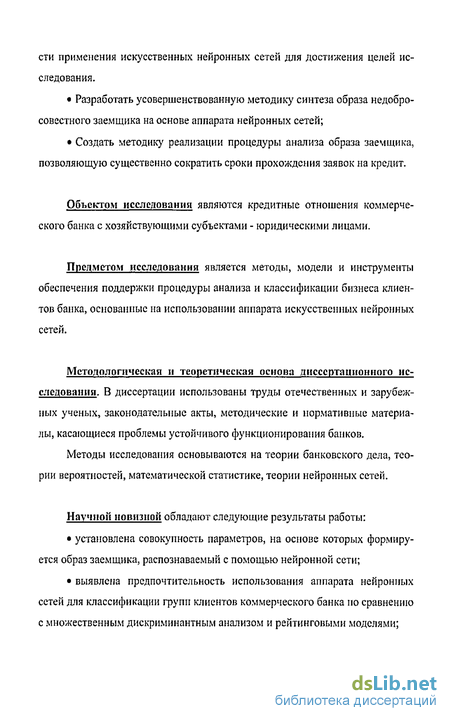 Цель и задачи исследования. Целью диссертационного исследования является решение задачи снижения кредитных рисков посредством разработки методики и инструментов для формирования образа клиента коммерческого банка на основе аппарата искусственных нейронных сетей.