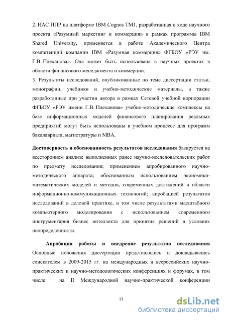 всестороннем анализе выполненных ранее научно-исследовательских работ по предмету исследования; применением в исследованиях апробированного научно-методического аппарата; обоснованным использованием экономико-математических моделей и методов, современных достижений в области информационно-коммуникационных технологий; апробацией результатов исследований в деловой практике, в том числе результатами масштабного компьютерного моделирования с использованием современного инструментария бизнес - интеллекта для принятия решений в условиях неопределенности.