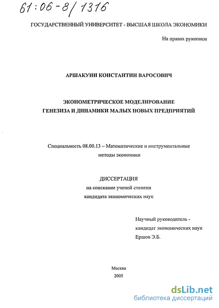 • сконструировать и оценить модели генезиса и динамики новых предприятий, учитывающие эндогенность начальных условий инвестиционных проектов. Объектом настоящего исследования являются малые новые предприятия. Предмет исследования - условия генезиса и процессы рыночной динамики малых новых предприятий.
