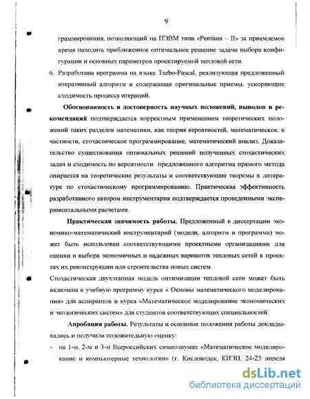 граммирования, позволяющий на ПЭВМ типа «Pentium - II» за приемлемое время находить приближенное оптимальное решение задачи выбора конфигурации и основных параметров проектируемой тепловой сети. 6. Разработана программа на языке Turbo-Pascal реализующая предложенный итеративный алгоритм и содержащая оригинальные приемы, ускоряющие сходимость процесса итераций. Обоснованность и достоверность научных положений, выводов и рекомендаций подтверждается корректным применением теоретических положений таких разделов математики, как теория вероятностей, математическое, в частности, стохастическое программирование, математический анализ. Доказательство существования оптимальных решений полученных стохастических задач и сходимость по вероятности предложенного алгоритма прямого метода опирается на теоретические результаты и соответствующие теоремы в литературе по стохастическому программированию. Практическая эффективность разработанного автором инструментария подтверждается проведенными экспериментальными расчетами.