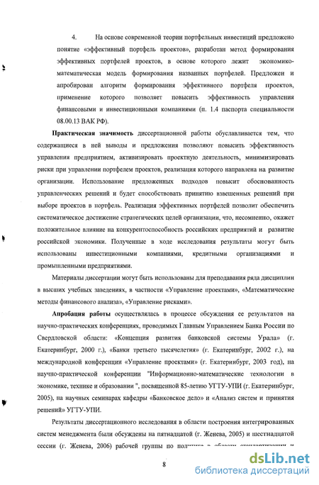 Отдельные положения диссертации излагались автором при проведении лекций и ч семинаров со студентами УГТУ-УПИ в рамках курсов «Сетевая экономика», «Управление проектами», «Математические методы финансового анализа», читавшихся на факультете информационно-математических технологий и экономического моделирования УГТУ-УПИ. Практическое внедрение результатов диссертационного исследования проведено в инвестиционных компаниях, кредитных организациях и промышленных предприятиях города Екатеринбурга. Рекомендации и выводы диссертации использовались при формировании портфеля проектов «Банк24.ру» (ОАО), ООО «Управляющая компания «Кронверк», 000 «Универсальная инвестиционная компания Партнер». Практические результаты автора исследования подтверждены соответствующими документами.