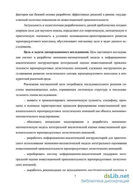Цель и задачи диссертационного исследования. Цель настоящего исследования состоит в разработке экономико-математической модели и информационно-аналитического инструментария интегральной оценки инвестиционной привлекательности зернопродуктовых логистических компаний, служащих инструментом регулирования развития логистического сектора зернопродуктового комплекса в конкурентной рыночной среде.