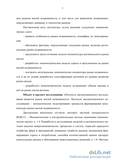 Цель и задачи диссертации. Цель исследования состоит в разработке экономико-математических моделей экономической конъюнктуры региональных рынков жилой недвижимости, в том числе для выявления детерминант, определяющих динамику и типологию рынков.