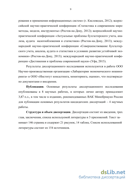 Апробация результатов диссертационной работы. Основные положения и результаты работы докладывались на: международной научно-практической конференции «Экономико-организационные проблемы проектирования и применения информационных систем» (г. Кисловодск, 2012); всероссийской научно-практической конференции «Статистика в современном мире: методы, модели, инструменты» (Ростов-на-Дону, 2012); всероссийской научно-практической конференции «Актуальные проблемы бухгалтерского учета, анализа, аудита налогообложения и статистики» (Ростов-на-Дону, 2013); международной научно-практической конференции «Совершенствование бухгалтерского учета, анализа, аудита и статистики в условиях развития устойчивой экономики» (Ростов-на-Дону, 2013); международной научно-практической конференции «Достижения и проблемы современной науки» (Уфа, 2015).