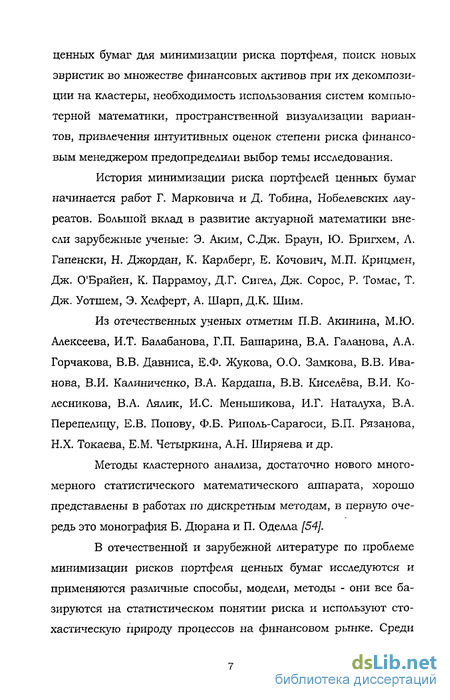 В отечественной и зарубежной литературе по проблеме минимизации рисков портфеля ценных бумаг исследуются и применяются различные способы, модели, методы - они все базируются на статистическом понятии риска и используют стохастическую природу процессов на финансовом рынке. Среди
