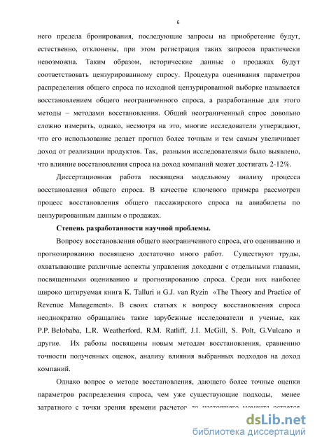 Однако вопрос о методе восстановления, дающего более точные оценки параметров распределения спроса, чем уже существующие подходы, менее затратного с точки зрения времени расчетов до настоящего момента остается открытым. Кроме того в опубликованных работах практически не уделяется внимание сравнению статистических свойств получаемых оценок, чувствительности методов ко всякого рода предположениям, в том числе к предположению о типе распределения спроса. Существующие подходы управления доходами не охватывают вопрос неполноты информации о цензурировании, когда для некоторых или всех наблюдений не известно, соответствуют они истинному спросу или подверглись цензурированию.