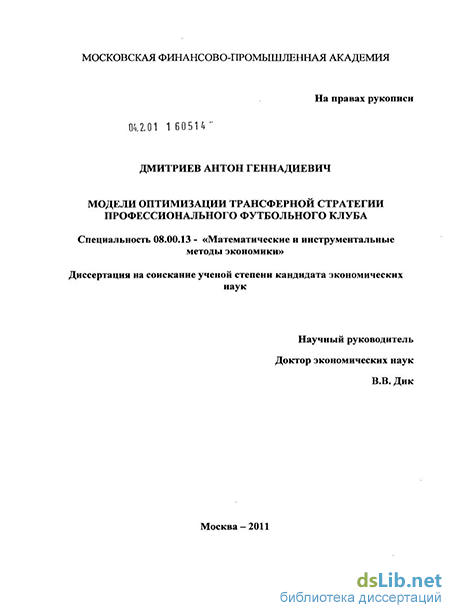 Глава 2. Система экономико-математических моделей анализа трансферных стратегий профессиональных футбольных клубов 58