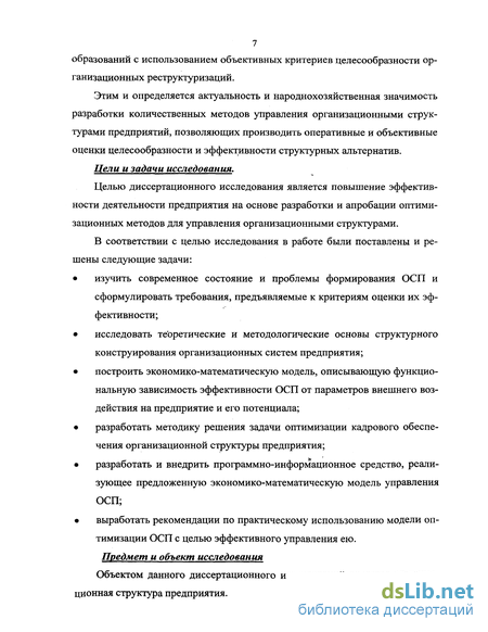 Целью диссертационного исследования является повышение эффективности деятельности предприятия на основе разработки и апробации оптимизационных методов для управления организационными структурами.