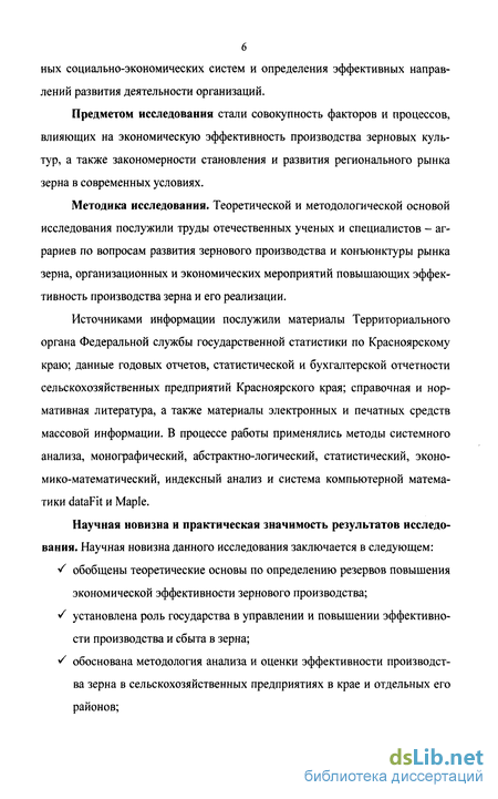 Предметом исследования стали совокупность факторов и процессов, влияющих на экономическую эффективность производства зерновых культур, а также закономерности становления и развития регионального рынка зерна в современных условиях.