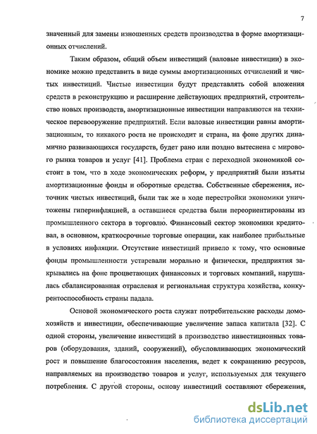 Таким образом, общий объем инвестиций (валовые инвестиции) в экономике можно представить в виде суммы амортизационных отчислений и чистых инвестиций. Чистые инвестиции будут представлять собой вложения средств в реконструкцию и расширение действующих предприятий, строительство новых производств, амортизационные инвестиции направляются на техническое перевооружение предприятий. Если валовые инвестиции равны амортизационным, то никакого роста не происходит и страна, на фоне других динамично развивающихся государств, будет рано или поздно вытеснена с мирового рынка товаров и услуг [41]. Проблема стран с переходной экономикой состоит в том, что в ходе экономических реформ, у предприятий были изъяты амортизационные фонды и оборотные средства. Собственные сбережения, источник чистых инвестиций, были так же в ходе перестройки экономики уничтожены гиперинфляцией, а оставшиеся средства были переориентированы из промышленного сектора в торговлю. Финансовый сектор экономики кредитовал, в основном, краткосрочные торговые операции, как наиболее прибыльные в условиях инфляции. Отсутствие инвестиций привело к тому, что основные фонды промышленности устаревали морально и физически, предприятия закрывались на фоне процветающих финансовых и торговых компаний, нарушалась сбалансированная отраслевая и региональная структура хозяйства, конкурентоспособность страны падала.