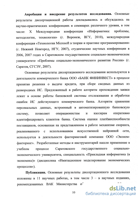 деятельности коммерческого банка ООО «БАНК ФИНИНВЕСТ» в процессе принятия решения о выдаче кредита, при сборе сводных данных из разнородных ИС. Предложенный в работе алгоритм прохождения заявки лежит в основе работы банковской системы отслеживания и обработки ошибок ИС действующего коммерческого банка. Алгоритм сравнения персональных данных, встроенный в автоматизированную банковскую систему, позволяет операционистам и кассирам оперативно идентифицировать клиентов банка. Система оценки платёжеспособности поставщиков, основанная на представленном в работе механизме скоринга, реализованного с использованием искусственной нейронной сети, используется в деятельности факторинговой компании 000 «Эконом-факторинг». Разработанные методы и инструментарий нашли применение в учебном процессе Саратовского государственного социально-экономического университета, специальность «Прикладная информатика (в экономике)» (дисциплина «Имитационное моделирование экономических процессов»).