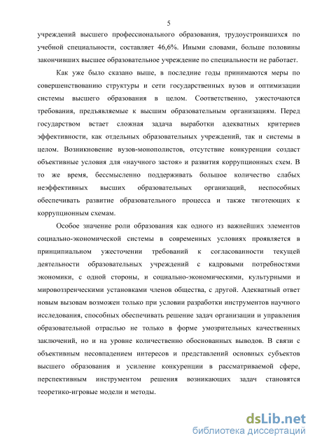 Особое значение роли образования как одного из важнейших элементов социально-экономической системы в современных условиях проявляется в принципиальном ужесточении требований к согласованности текущей деятельности образовательных учреждений с кадровыми потребностями экономики, с одной стороны, и социально-экономическими, культурными и мировоззренческими установками членов общества, с другой. Адекватный ответ новым вызовам возможен только при условии разработки инструментов научного исследования, способных обеспечивать решение задач организации и управления образовательной отраслью не только в форме умозрительных качественных заключений, но и на уровне количественно обоснованных выводов. В связи с объективным несовпадением интересов и представлений основных субъектов высшего образования и усилением конкуренции в рассматриваемой сфере, перспективным инструментом решения возникающих задач становятся теоретико-игровые модели и методы.