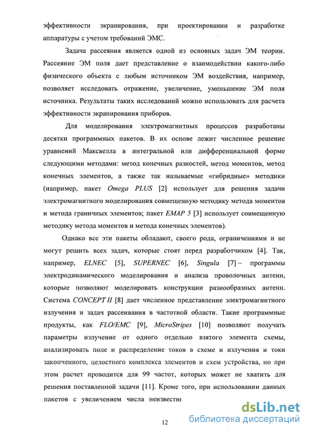 Однако обзор существующих исследований выявил нерешенные задачи. В частности, недостаточно исследованы возможности совершенствования существующих алгоритмов расчета рассеяния ЭМ волны. Нет методики расчета ЭМП на основе высокочастотных моделей, учитывающих паразитные параметры емкостного, индуктивного и резистивного характера реальных компонентов схемы и конструкции. В существующем программном обеспечении отсутствует возможность решить все поставленные перед разработчиками задачи, а цена их очень высока. Поэтому создание программ расчета рассеяния ЭМ волны на основе усовершенствованных алгоритмов и разработка методики математического моделирования излучения ЭМП на основе высокочастотных моделей с учетом паразитных параметров являются актуальными.