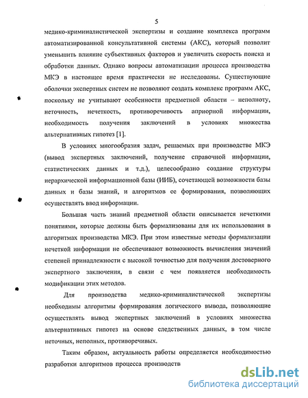 Одним из наиболее эффективных путей решения указанных проблем является автоматизация формирования заключений при производстве медико-криминалистической экспертизы и создание комплекса программ автоматизированной консультативной системы (АКС), который позволит уменьшить влияние субъективных факторов и увеличить скорость поиска и обработки данных. Однако вопросы автоматизации процесса производства МКЭ в настоящее время практически не исследованы. Существующие оболочки экспертных систем не позволяют создать комплекс программ АКС, поскольку не учитывают особенности предметной области - неполноту, неточность, нечеткость, противоречивость априорной информации, необходимость получения заключений в условиях множества альтернативных гипотез [1].