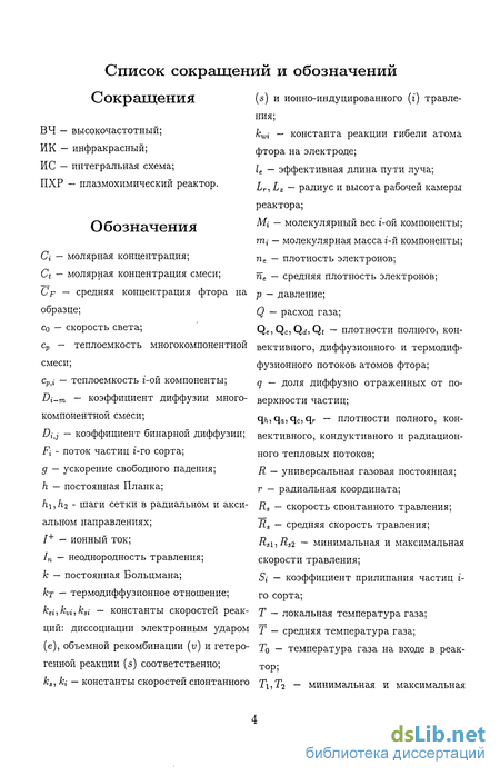 Под действием электронных ударов в плазме ВЧ-разряда и ионного тока в рабочем пространстве реактора возникает реагирующая среда, характеризующаяся совместным протеканием процессов ионизации, диссоциации, рекомбинации, переноса тепла и вещества с химическими реакциями. Аналогичные процессы идут на поверхности обрабатываемого образца и стенках камеры. В рассматриваемую модель включены процессы диссоциации исходного газа электронным ударом с образованием активной компоненты (атомов фтора) и рекомбинация последней с участием третьего тела [1, 36, 40, 41, 43, 77]. Различные схемы ПХР, представленные в главе 3, преимущественно используются для травления кремниевых пластин в плазме CF\ или смеси CF4/O2. Поэтому, объединяя различные подходы в описании кинетической модели реактора [2, 36, 40, 41, 43, 59, 73], приведем список химических реакций, который будем рассматривать в дальнейшем. В общем случае, когда исходная смесь состоит из те-трафторида углерода и кислорода, учитываются следующие реакции и процессы: акций гибели атомов фтора на верхнем и нижнем электродах. Для радикалов и частиц, адсорбированных на поверхности образца, используется обозначение (s).