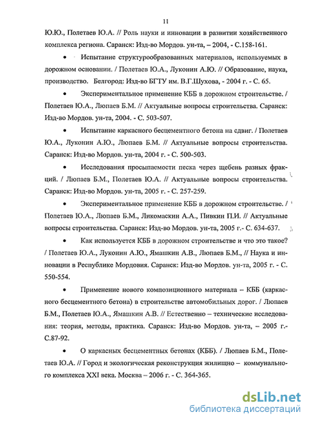 Применение нового композиционного материала - КББ (каркасного бесцементного бетона) в строительстве автомобильных дорог. / Люпаев Б.М., Полетаев Ю.А., Ямашкин А.В. // Естественно - технические исследования: теория, методы, практика. Саранск: Изд-во Мордов. ун-та, - 2005 г.-С.87-92.