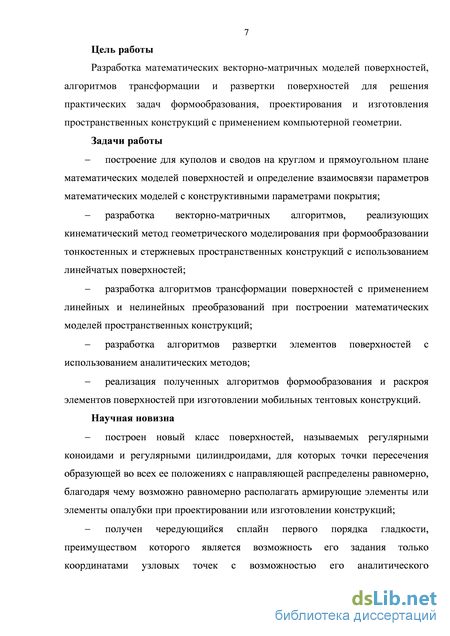 Разработка математических векторно-матричных моделей поверхностей, алгоритмов трансформации и развертки поверхностей для решения практических задач конструирования, проектирования и изготовления пространственных конструкций с применением компьютерной геометрии.