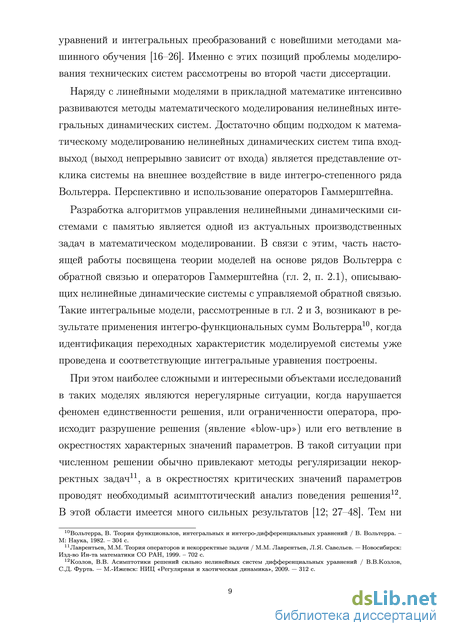 Таким образом, в работе проведены исследования нерегулярных классов линейных и нелинейных интегро-дифференциальных систем первого и второго рода с целью доказательства теорем существования, разработки комбинированных аналитико-численных методов решения, в том числе методов построения асимптотик параметрических семейств решений в классах как классических, так и обобщенных функций, построение главных членов асимптотики решений строятся в явном виде (см., например, теоремы 1.3.1, 2.1.5, 2.3.1, 2.4.1, 3.1.2). Особое внимание уделено исследованию математических моделей с феноменом неединственности (пп. 1.1, 1.3, 2.1, 2.3, 3.1, 3.3, 3.4, 3.5) и моделированию динамики систем в окрестности критических значений характерных параметров (модель колебания спутника (3.5.8) – (3.5.9), нестационарная модель неустойчивых межсистемных колебаний (5.1.18), (5.1.25), (5.1.26)). Использование методов машинного обучения, регрессионного анализа в синтезе с сингулярным интегральным преобразованием Гильберта позволило разработать новую методологию прогнозирования параметров электроэнергетических систем (п. 5.1, блок-схема 5.3). Двумерное оконное преобразование Фурье позволило разработать эффективный алгоритм подавления муарового шума, возникающего при оцифровке видеопоследовательностей (п. 5.2, рис. 5.21). Разработанный алгоритм подавления муарового шума использовался не только в рамках проекта рамочной программы ЕС BRAVA в восстановлении архивов компаний BBC (Великобритания), RTP (Португалия), института INA (Франция) (см. работы [52–55]), но и в других областях, включая обработку медицинских видео-последовательностей [56], в системах обнаружения целей [57], в проектировании автостереоскопических трехмерных дисплеев [58]. В итоге, в диссертации разработаны основы теории новых линейных и нелинейных математических моделей динамических систем с параметрами (гл. 1) и с феноменом неединственности (гл. 1, 2, 3) , построены численные методы и комплексы программ для решения проблем прогнозирования параметров систем электроэнергетики и моделирования их развития, задач реставрации видеоархивов и задач машинного зрения (гл. 4, 5). В диссертации проведено исследование вопросов разрешимости новых классов линейных нерегулярных уравнений Вольтерра I рода (п. 1.1, 1.3, 3.1), доказаны теоремы существования непрерывных и обобщенных решений линейных и нелинейных систем в нерегулярных случаях (гл. 1, 2, 3). Используя интегральные преобразования в синтезе с методами непрерывной и дискретной математики, построена гибридная модель, позволяющая прогнозировать поведение параметров электроэнергетических систем в окрестностях критических значений параметров. Подобная методика позволила также разработать спектральный метод параметрической фильтрации видео-последовательностей.