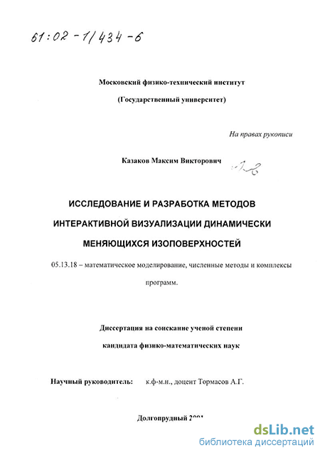 Казаков Максим Викторович. Исследование и разработка методов интерактивной визуализации динамически меняющихся изоповерхностей : диссертация ... кандидата физико-математических наук : 05.13.18.- Долгопрудный, 2001.- 126 с.: ил. РГБ ОД, 61 02-1/434-6