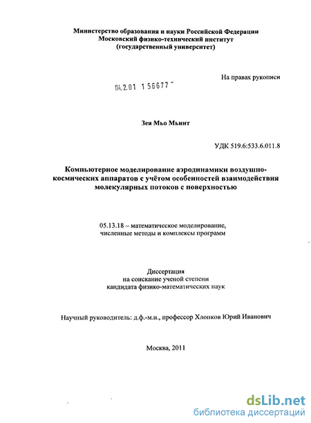 I. Актуальность темы диссертации. В связи с широким применением вычислительной техники во всех отраслях естественных, технических и даже гуманитарных наук методы математического моделирования стали важнейшим средством исследовательской деятельности. Создание математических и вычислительных моделей и их реализация в виде комплексов программ является главным направлением современного процесса математизации наук.. Однако простое заимствование моделей далеко не всегда осуществимо, даже формально. Возникает необходимость создания нового математического аппарата, разработки новых математических средств и методов, отражающих специфику области приложения. Развитие космической техники и высотной авиации требует надежных данных об аэродинамических характеристиках (АДХ) во всем диапазоне режимов течения: от сплошносредного до свободномолекулярного. Сложность разработки воздушно-космических аппаратов (ВКА) обусловливается целым рядом трудностей воспроизведения натурных условий полета в аэродинамических трубах. В частности, практически невозможно воспроизвести тепловой режим при обтекании аппарата: нагрев модели в трубе приводит к высокому значению температурного фактора, тогда как в натурных условиях температура поверхности аппарата значительно меньше полной температуры потока. Моделирование высокоскоростных течений предполагает соблюдение и других критериев подобия, в первую очередь по числам Маха и Рейнольдса. Перечисленные факторы обусловливают необходимость привлечения расчетной информации на этапе проектирования ВКА. При движении аппаратов в нижних слоях атмосферы приходят к задачам, которые могут быть решены в рамках теории сплошной среды с применением уравнений Навье-Стокса и Эйлера. При полете в верхних слоях атмосферы, где необходимо учитывать молекулярную структуру газа, применяются кинетические модели, в частности, уравнение Больцмана и соответствующие