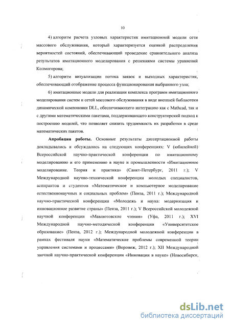 Апробация работы. Основные результаты диссертационной работы докладывались и обсуждались на следующих конференциях: V (юбилейной) Всероссийской научно-практической конференции по имитационному моделированию и его применению в науке и промышленности «Имитационное моделирование. Теория и практика» (Санкт-Петербург, 2011 г.); V Международной научно-технической конференции молодых специалистов, аспирантов и студентов «Математическое и компьютерное моделирование естественнонаучных и социальных проблем» (Пенза, 2011 г.); Международной научно-практической конференции «Молодежь и наука: модернизация и инновационное развитие страны» (Пенза, 2011 г.); V Всероссийской молодежной научной конференции «Мавлютовские чтения» (Уфа, 2011 г.); XVI Международной научно-методической конференции «Университетское образование» (Пенза, 2012 г.); Международной молодежной конференции в рамках фестиваля науки «Математические проблемы современной теории управления системами и процессами» (Воронеж, 2012 г.); XII Международной заочной научно-практической конференции «Инновации в науке» (Новосибирск, 2012 г.); VIII Международной научно-практической конференции «Современное состояние естественных и технических наук»