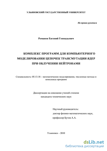 Методы исследования. В диссертационной работе используются методы математического моделирования динамических систем, методы решения задачи Коши для системы ОДУ, методы поиска пути на графе. Комплекс программ создан при помощи методов объектно–ориентированного и визуального программирования. Для программной реализации моделей используется аппарат численного математического моделирования и библиотеки подпрограмм компьютерной математики. Апробация созданных программ проводится путём сравнения результатов их работы со значениями, полученными при облучении в экспериментальных устройствах исследовательского ядерного реактора.