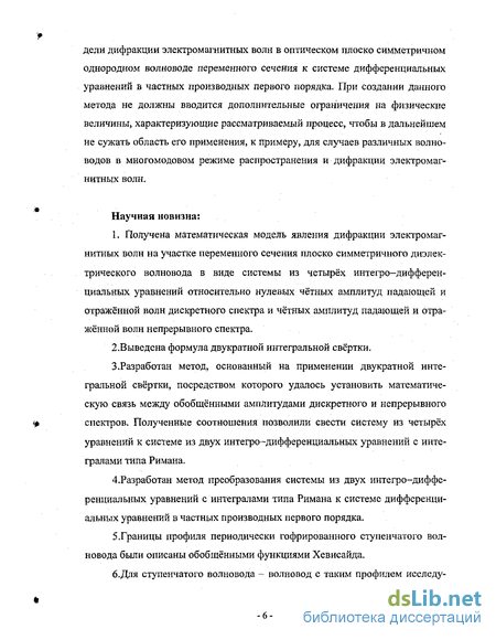5.Границы профиля периодически гофрированного ступенчатого волновода были описаны обобщёнными функциями Хевисайда. б.Для ступенчатого волновода - волновод с таким профилем исследу- ется впервые — система из двух дифференциальных уравнений в частных производных первого порядка была сведена в одном случае — горизонтальные участки волновода - к системе из двух обыкновенных однородных дифференциальных уравнений первого порядка, а в другом - вертикальные участки волновода - к двум не связанным между собой дифференциальным уравнениям в частных производных первого порядка.
