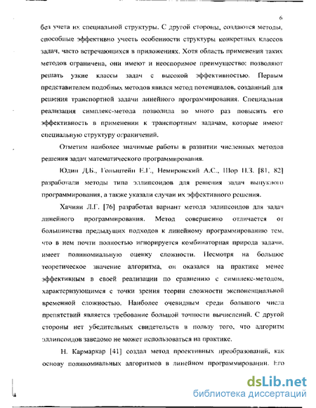 Хачиян Л.Г. [76] разработал вариант метода эллипсоидов для задач линейного программирования. Метод совершенно отличается от большинства предыд>щих подходов к линейному программированию тем. что в нем почти полностью игнорируется комбинаторная природа задачи, имеет полиномиальную оценку сложности. Несмотря на большое теоретическое значение алгоритма, он оказался на практике менее эффективным в своей реализации по сравнению с симплекс-методом, характеризующимся с точки зрения теории сложности экспоненциальной временной сложностью. Наиболее очевидным среди большого числа препятствий является требование большой точности вычислений. С другой стороны нет убедительных свидетельств в пользу того, что алгоритм эллипсоидов заведомо не может использоваться на практике.