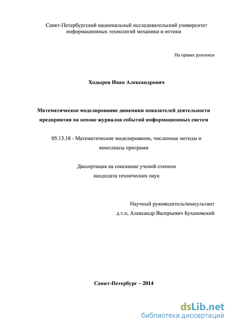 Ходырев Иван Александрович. Математическое моделирование динамики показателей деятельности предприятия на основе журналов событий информационных систем: диссертация ... кандидата технических наук: 05.13.18 / Ходырев Иван Александрович;[Место защиты: Федеральное государственное бюджетное образовательное учреждение высшего профессионального образования «Санкт-Петербургский национальный исследовательский университет информационных технологий, механики и оптики»].- Санкт-Петербург, 2014.- 144 с.