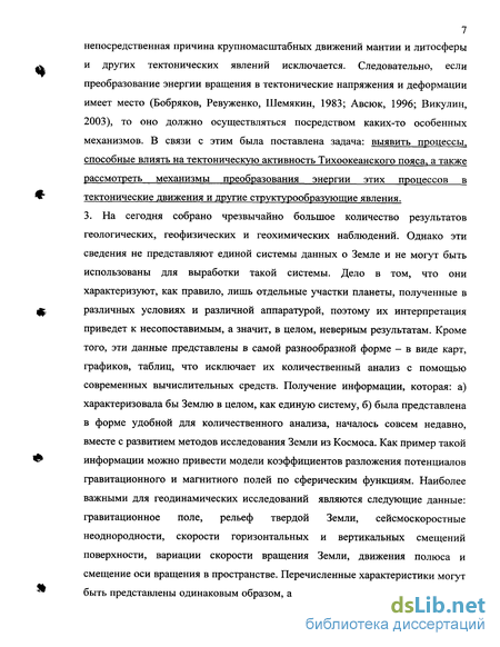 2. Одной из основных проблем геодинамики является проблема движущих сил. В качестве возможных рассматриваются силы, вызываемые конвекцией, отрицательной плавучестью погружающейся литосферы, рифтовые и другие. Как правило, перечисленные силы связывают с запасами тепловой энергии в недрах планеты. В то же время существуют другие источники энергии, способные влиять на ее тектоническую активность. Таковой является, например, солнечная радиация. За год Земля поглощает примерно 2.1 1031 эрг, что на три порядка больше энергии, выделяющейся за счет потока тепла через ее поверхность. Многие исследователи причину тектогенеза видят в ротационном режиме планеты - изменениях скорости вращения, движениях полюса и взаимодействии с Луной и Солнцем. Действительно, наблюдения показывают, что между вращением Земли, ее тектонической активностью и физическими полями существует тесная связь. Запас энергии осевого вращения планеты очень велик. Он составляет примерно 10 эрг. Однако, простые оценки (Ранкорн, 1975) показывают, что инерционные силы и силы Кориолиса малы по сравнению с вязкими. На этом основании вращение планеты как непосредственная причина крупномасштабных движений мантии и литосферы и других тектонических явлений исключается. Следовательно, если преобразование энергии вращения в тектонические напряжения и деформации имеет место (Бобряков, Ревуженко, Шемякин, 1983; Авсюк, 1996; Викулин, 2003), то оно должно осуществляться посредством каких-то особенных механизмов. В связи с этим была поставлена задача: выявить процессы, способные влиять на тектоническую активность Тихоокеанского пояса, а также рассмотреть механизмы преобразования энергии этих процессов в тектонические движения и другие структурообразующие явления. 3. На сегодня собрано чрезвычайно большое количество результатов геологических, геофизических и геохимических наблюдений. Однако эти сведения не представляют единой системы данных о Земле и не могут быть использованы для выработки такой системы. Дело в том, что они характеризуют, как правило, лишь отдельные участки планеты, полученные в различных условиях и различной аппаратурой, поэтому их интерпретация приведет к несопоставимым, а значит, в целом, неверным результатам. Кроме того, эти данные представлены в самой разнообразной форме - в виде карт, графиков, таблиц, что исключает их количественный анализ с помощью современных вычислительных средств. Получение информации, которая: а) характеризовала бы Землю в целом, как единую систему, б) была представлена в форме удобной для количественного анализа, началось совсем недавно, вместе с развитием методов исследования Земли из Космоса. Как пример такой информации можно привести модели коэффициентов разложения потенциалов гравитационного и магнитного полей по сферическим функциям. Наиболее важными для геодинамических исследований являются следующие данные: гравитационное поле, рельеф твердой Земли, сейсмоскоростные неоднородности, скорости горизонтальных и вертикальных смещений поверхности, вариации скорости вращения Земли, движения полюса и смещение оси вращения в пространстве. Перечисленные характеристики могут быть представлены одинаковым образом, а именно - наборами коэффициентов разложения по сферическим функциям, что позволяет эффективно использовать с