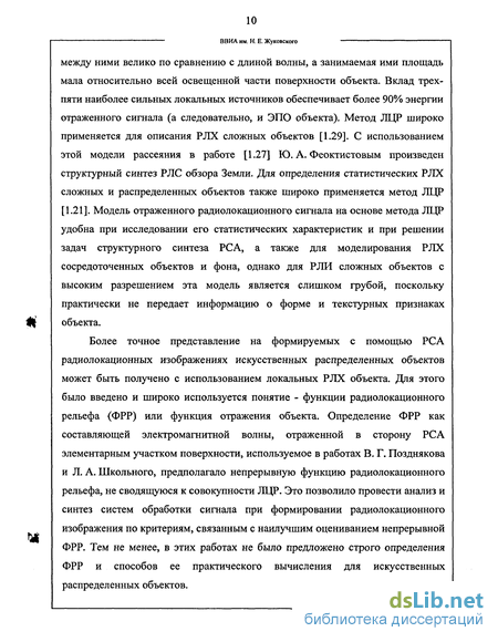 Более точное представление на формируемых с помощью РСА радиолокационных изображениях искусственных распределенных объектов может быть получено с использованием локальных РЛХ объекта. Для этого было введено и широко используется понятие - функции радиолокационного рельефа (ФРР) или функция отражения объекта. Определение ФРР как составляющей электромагнитной волны, отраженной в сторону РСА элементарным участком поверхности, используемое в работах В. Г. Позднякова и Л. А. Школьного, предполагало непрерывную функцию радиолокационного рельефа, не сводящуюся к совокупности ЛЦР. Это позволило провести анализ и синтез систем обработки сигнала при формировании радиолокационного изображения по критериям, связанным с наилучшим оцениванием непрерывной ФРР. Тем не менее, в этих работах не было предложено строго определения ФРР и способов ее практического вычисления для искусственных распределенных объектов.