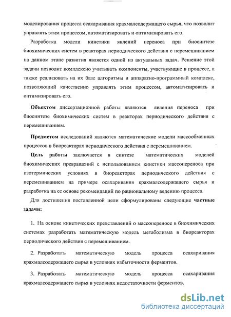 Цель работы заключается в синтезе математических моделей биохимических превращений с использованием кинетики массопереноса при изотермических условиях в биореакторах периодического действия с перемешиванием на примере осахаривания крахмалсодержащего сырья и разработка на ее основе рекомендаций по рациональному ведению процесса.